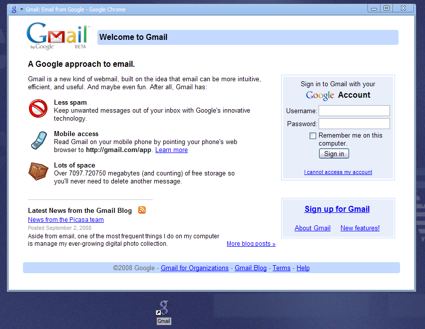 4. Poof: a shortcut appears and the browser controls (Omnibar, next and back buttons, etc.) disappear. Funny, doesn’t that web app now look very much like a traditional desktop app? In fact, the only control that really shows you’re still in the browser is a little pulldown menu that appears in the top left of the window border.