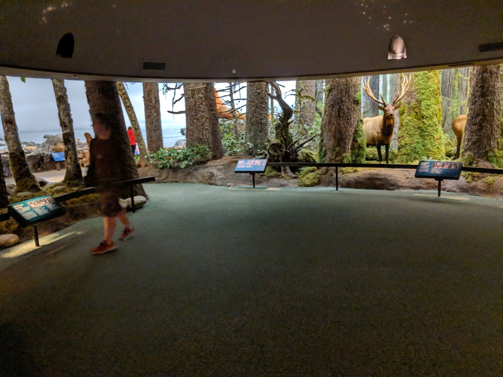 We started our first full day by walking around the harbor, checking out the BC Parliament building, and visiting the Royal BC Museum. The museum had a nice display of First Nations art, as well as displays on the environment in British Columbia and the European settlement of the area. The latter two exhibits were interesting; they made heavy use of immersive spaces to try to communicate what it was like to visit an area or live during a particular era. I enjoyed them; it was a bit like a cross between a more conventional static display and a Disney-esque recreation (some of the areas were even scented to enhance the illusion.