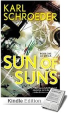 I finished Sun of Suns, the second of my free Kindle books from Tor, on my flight out to Boston. Overall it was also rather good, although in a different way. While Old Man’s War was an enjoyable story, Sun of Suns is notable more for the world that Karl Schroeder creates than for the plot itself (which, while swashbuckling sailors with wooden boats in zero G in a giant enclosed sphere are fun, is a little flat). But hey, swashbuckling sailors! Pirates! Multiple freefloating towns inside an air-filled hollow sphere! What’s not to like, in a ok-it’s-still-summer-and-I’m-happy-not-to-think-too-hard kind of a way?